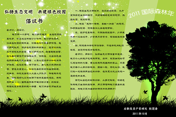 为贯彻落实全国绿化委员会、国家林业局印发的《2011国际森林年中国行动方案》,从10月26日起,利用两个月时间,我校后勤及资产管理处、校团委开展了以“弘扬生态文明,共建绿色校园”为主题的“2011国际森林年”系列活动。