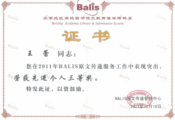 12月16日,BALIS原文传递管理中心在中国人民大学举行了“BALIS原文传递2011年度工作总结及先进集体与个人表彰大会”。大会总结了2011年工作,明确了2012年工作方向,并对工作成绩优异的16个集体和46名个人进行表彰。我校图书馆王蕾同志荣获BALIS原文传递服务工作先进个人三等奖。