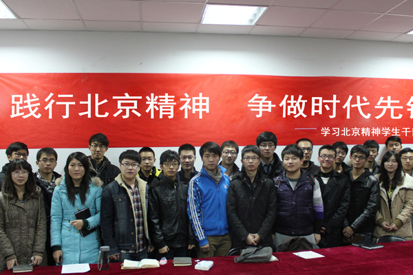 校团委组织部部长、校学生会秘书长谢均岩强调,大学生践行“北京精神”,就要把自己的发展和祖国的建设、北京城市的建设以及学校的发展结合起来,努力提升个人能力、修炼品德,以真正的“厚德”载起“爱国 创新 包容 ”的精神品质;广大学生干部要从自身实际出发,大处着眼、小处着手,扎实学好科学文化知识,做好本职工作。他要求学生干部要继续、并带领身边的同学认真学习倡议书,继承革命优良传统、弘扬爱国主义精神,牢记历史、承载使命、砥砺前行,以高度的社会责任感和使命感深入“北京精神”,以自身行动推动北京的全面发展,为祖国的腾飞而奋斗。