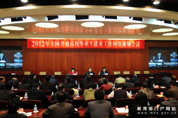 2012年全国普通高校毕业生就业工作视频会议11月21日在京召开。教育部党组书记、部长袁贵仁出席会议并讲话。他强调,要深入贯彻落实党的十七届六中全会、教育规划纲要和《国务院关于进一步做好普通高等学校毕业生就业工作的通知》精神,切实加大政策落实力度,深入开展“就业优质服务”活动,加快建立健全高校毕业生就业服务体系,全力做好高校毕业生就业工作。教育部党组副书记、副部长杜玉波主持会议。