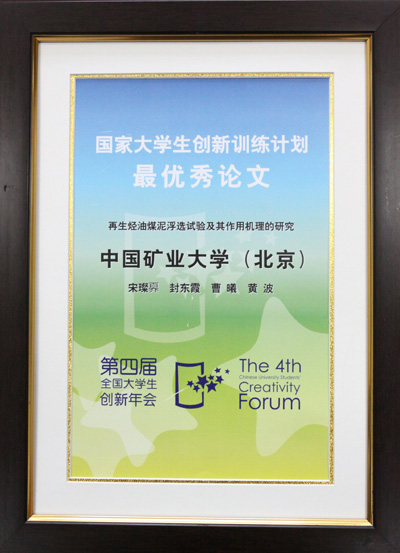 10月22至23日,由教育部、科技部主办,同济大学承办的“第四届全国大学生创新年会”在上海同济大学举行。我校2007级矿物加工工程专业本科生宋璨奡、曹曦、封东霞为主要作者撰写的论文《再生烃油煤泥浮选试验及其作用机理的研究》荣获“第四届全国大学生创新年会”颁发的“国家大学生创新训练计划最优秀论文奖”,该论文是宋璨奡等同学在化环学院黄波老师指导下,参加国家大学生创新性实验计划“再生烃油制备煤泥浮选药剂的研究”项目取得的研究成果。