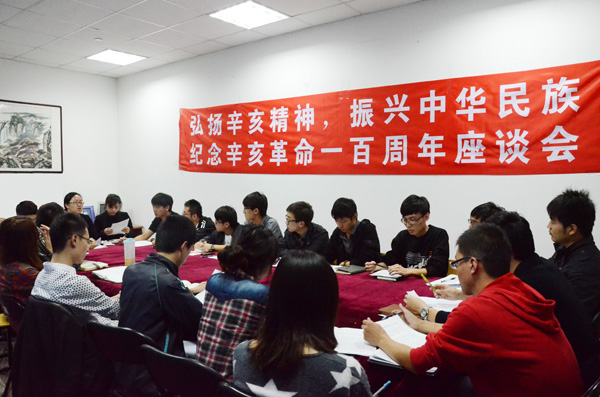 座谈会上,同学们认真学习了胡锦涛同志在纪念辛亥革命100周年大会上的讲话,并畅谈了对辛亥革命及其历史功绩的看法。校团委宣传部张晓莹同学认为,学习贯彻胡锦涛同志讲话精神,最根本的就是高举中国特色社会主义伟大旗帜,坚持走这条正确道路,坚持这个核心力量的领导,在实现民族复兴的征程上不懈奋斗。文法学院郭帅同学认为,中华民族的奋发向上、团结进步的精神值得学习,在日常学生会工作中,要正确把握校学生会和院学生会的关系,让大家认识到学生会不仅是一个为同学服务的载体,更是广大青年学生们的精神载体。管理学院娄凌斌同学认为,中华民族的伟大复兴要从新一代大学生抓起,在日常生活中加强体育锻炼,强健体魄。从思想上武装自己,学习知识,了解时事,关注民生。