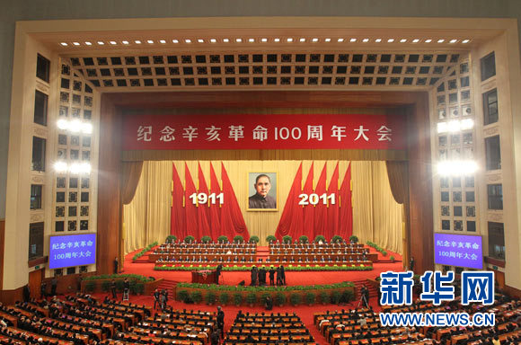 人民大会堂大礼堂主席台台口上方悬挂着“纪念辛亥革命100周年大会”会标,后幕正中是孙中山先生的巨幅画像,十面鲜艳的红旗分列两侧,上面悬挂的“1911”“2011”字标格外醒目。