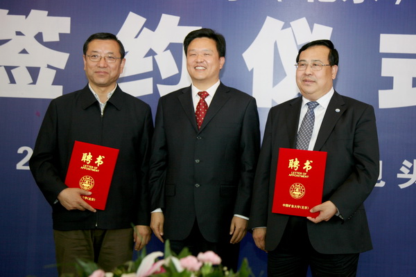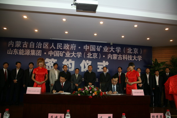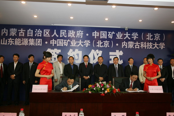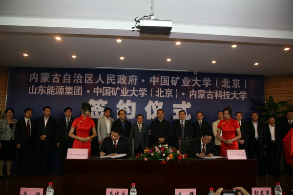 内蒙古自治区人民政府副主席连辑,中国矿业大学(北京)校长乔建永在战略合作协议书上签字。同时中国矿业大学(北京)与山东能源集团、内蒙古科技大学签署校企、校校战略合作协议。标志着中国矿业大学(北京)构建协同创新联盟迈出了实质性步伐。