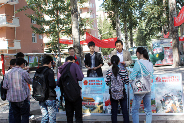 为增强我校学生国防观念和国防意识,引导并帮助学生关注国防、了解政策,进一步激发学生爱国热情,为今冬征兵工作奠定坚实基础,9月19日,校党委武装部面向全校学生开展了2011年国防法规、政策宣传活动。党委武装部、学生工作处相关老师参加了活动。
