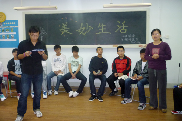 同学们在心理训练营教练的带领下开始了“人椅”活动。同学们在彼此的配合下,互相团结,不断缩短距离,完成了目标,为活动营造了温馨的气氛。同学们通过“手语相识”打开话匣子,使参加活动的同学彼此了解,相互之间进行了真诚交谈。同学们还分组做了“十八问”,“无声世界”和“同舟共济”等,现场气氛热烈,同学们积极性高涨。