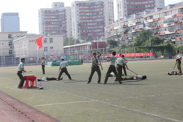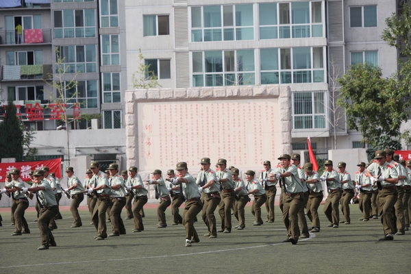 伴着雄壮的军乐曲,受阅方队开始进行分列式汇报表演。各受阅方阵依次正步走过主席台,军容严整,步伐矫健,英气十足,展示了两周来艰苦训练的成果。主席台上就座的领导们纷纷起身,向同学们鼓掌示意。参训学生进行了精彩的单个军人队列动作、太极拳、警官棍、应急棍、刺杀操、擒敌拳等军事科目的表演,他们良好的精神风貌、严整的军容、整齐划一的动作和高超的技艺赢得了全场师生的热烈掌声。