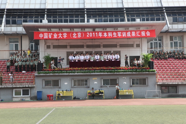 军歌嘹亮,梦想飞扬。9月2日下午,我校2011年本科生军训成果汇报会在田径场隆重举行。校党委书记杨仁树、校长乔建永、副校长孙继平、范迅、姜耀东、王忠强,党委副书记朱书全、校长助理吴郭泉、承训部队武警北京指挥学院副院长苏铁志大校、刘新刚少校以及各学院和相关部门的负责同志出席大会,大会由朱书全主持。