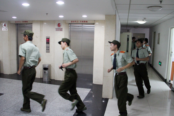 为预防紧急突发事件,增强学生的安全防患意识,8月31日早晨6:30,校党委武装部举行了军训学生紧急疏散演练。随着一阵紧急短促的哨声,1300多名军训学生迅速起床。担任安全员的寝室长在宿舍门口组织同学有序疏散,担任宣传员的副排长在楼梯口和转角处指挥学生安全撤离,同学们从宿舍门口开始,依次成两路纵队行进,分别扶住楼梯扶手和墙面,防止踩踏和其他事故的发生。在本层同学撤离之后,安全员和宣传员方才下楼,整个过程有条不紊,紧张有序。