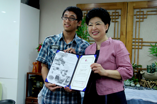 我校学生接受韩国饮食文化研究院院长金秀珍女士颁发的该研究院的结业证书