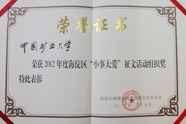日前,海淀区精神文明建设委员会办公室对2012年度海淀区“小事大爱”征文活动进行表彰,中国矿业大学(北京)获组织奖,是4所获奖高校之一。机电与信息工程学院2011级学生梁爽获得银奖。