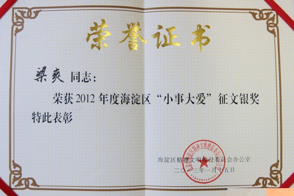 我校荣获2012年度海淀区“小事大爱”征文活动组织奖