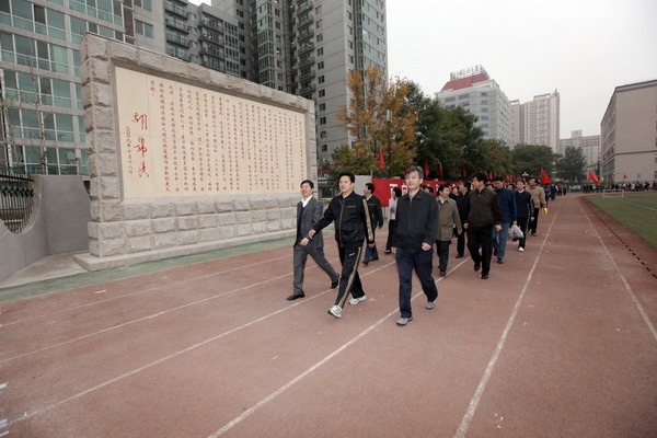 “出发!”随着乔建永校长的发令,健步行活动开始,学校领导带领着以工会为单位列队的教职员工健步前行。健步行队伍从民族楼广场出发,环绕学校健步,成为了校园一道流动的风景线,把运动的热情传递到了每一个角落。队伍先后经过1号办公楼前江泽民“开拓创新,严谨治学,把中国矿业大学办成一流的能源科技大学”校庆题词纪念碑、综合楼广场蔡元培“好学力行”题词石刻、科技楼、教学实验楼温家宝题字的孙越崎先生铜像广场、田径场。所经之处,旗帜飘扬,场面壮观,吸引了不少关注的目光。尤其是田径场里,当健步行的队伍经过刻有胡锦涛总书记为矿大百年校庆的贺信的纪念碑时,队伍和纪念碑交相辉映,形成了一道庄严、亮丽的风景线。教职员工个个精神抖擞、步履矫健,充分展示了矿大人积极向上的精神风貌。队伍在田径场绕场两周后行至图书馆,整个活动圆满结束。