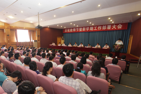在全国教育工作会议胜利召开、《国家中长期教育改革和发展规划纲要》颁布后的第一个教师节之际,9月10日下午,我校在国际交流中心学术报告厅召开庆祝教师节暨新学期工作部署大会,热烈庆祝第26个教师节,隆重表彰2008年以来在教学科研方面做出突出贡献的教师,总结2010年上半年工作,对下半年重点工作进行部署。校党委书记杨仁树,校长乔建永,中国工程院士彭苏萍,副校长孙继平、范迅、姜耀东、王忠强,校党委副书记朱书全,中共北京市委教育工委联络员范国英出席会议。全校副高职及以上教师,各学院班子成员、系(教研室)主任、党支部书记,教代会民主管理委员会成员,机关教辅科级以上干部,后勤各中心主任,离退休同志代表等200余人参加了大会。朱书全主持了会议。