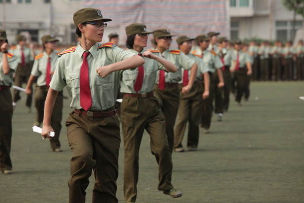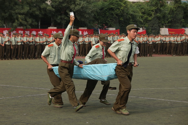 之后,参训学生进行了精彩的内务、单个军人队列动作、军体拳、匕首操、步兵班战术等军事科目的表演,他们良好的精神风貌、严整的军容、整齐划一的动作和高超的技艺赢得了全场师生的热烈的掌声。尤其是女生内务整理表演和匕首操表演,她们一改平日的文静,高呼嘹亮的军中口号,她们收起飘逸亮丽的裙子,身着统一的迷彩军装,她们巾帼不让须眉,以坚韧的意志展现了矿大女生特有的飒爽英姿,成为军训场上一道靓丽的风景线。