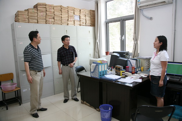 会后,在王忠强、朱书全带领下,学校有关部门工作人员一行数人,在校园内进行了全面彻底的检查。王忠强详细了解了教学楼、学生食堂在暑假期间的安排情况,要求有关人员要以服务学生为宗旨,做好后勤服务工作。在学生食堂,王忠强要求要保证师生饮食卫生,不断提高饭菜质量,确保学生饮食健康。王忠强重点检查了校园内的管道设施和下水管道的水位情况,实地查看了教学实验楼、学生公寓十号楼的电力中控室,要求有关部门做好安全防患工作。王忠强还特别检查了新建的机电学院、力建学院办公楼。