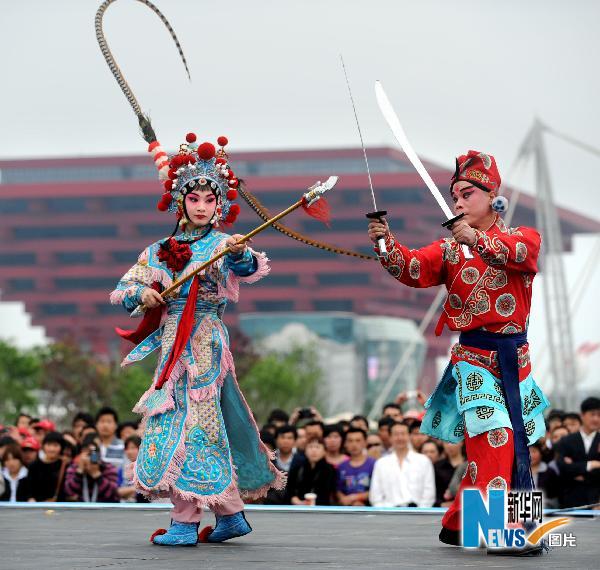 5月15日,在上海世博园庆典广场,演员在表演河北梆子《扈家庄》。新华社记者李紫恒摄