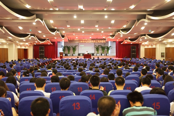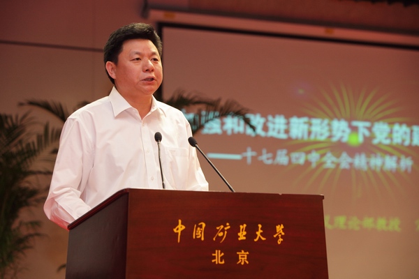 为深入贯彻落实党的十七届四中全会精神,进一步加强和改进党我校党的建设,5月26日下午,中央党校马克思主义理论教研部思想政治教育教研室宋福范教授,应邀在科技会堂报告厅为我校党员作了一场学习十七届四中全会精神辅导报告。校党委书记杨仁树,副校长姜耀东、王忠强,校党委副书记朱书全出席了报告会。全校教职工党员、学生党员代表近千人聆听了报告会。杨仁树主持了会议。