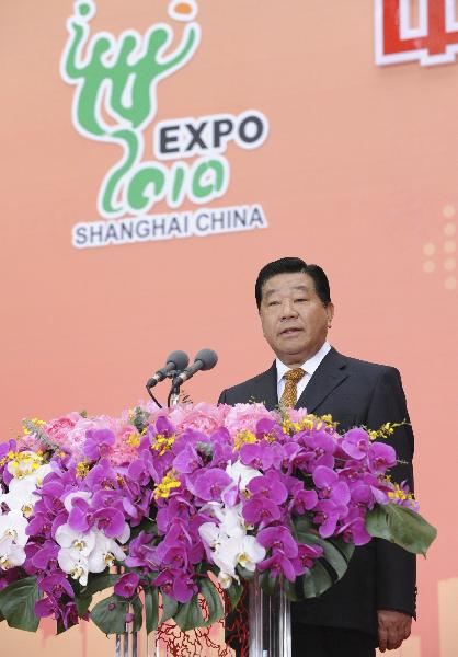 5月1日,中共中央政治局常委、全国政协主席贾庆林在上海世博园世博中心出席中国2010年上海世博会开园仪式。这是贾庆林在开园仪式上致辞。新华社记者 黄敬文 摄
