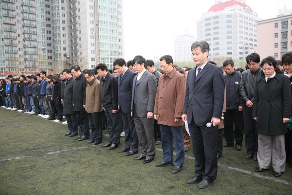 为表达对青海玉树地震遇难同胞的深切哀悼,遵照国务院公告精神,校党委书记杨仁树、校长乔建永,中国工程院院士彭苏萍,副校长孙继平、范迅、姜耀东、王忠强,校党委副书记朱书全及千余名师生怀着悲痛的心情来到操场,参加“矿大师生沉痛哀悼青海玉树地震遇难同胞”活动。