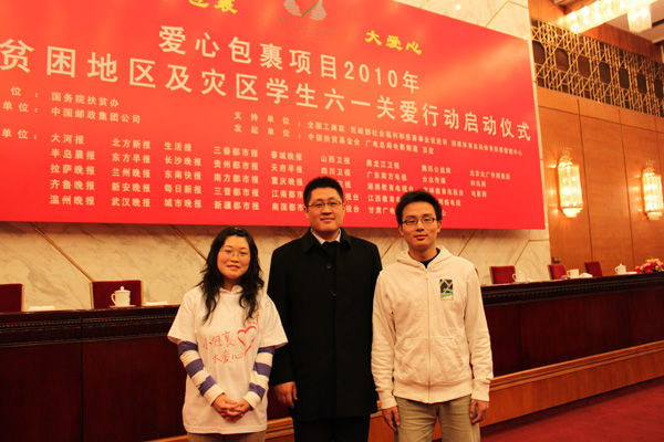 4月12日,“小包裹 大爱心——中国扶贫基金会爱心包裹项目2010年全国贫困地区及灾区学生六一关爱行动启动仪式”在人民大会堂举行。我校资助管理中心副主任王庆多,校自强社社长黄熊受邀参加启动仪式。
