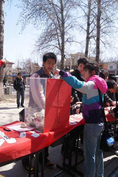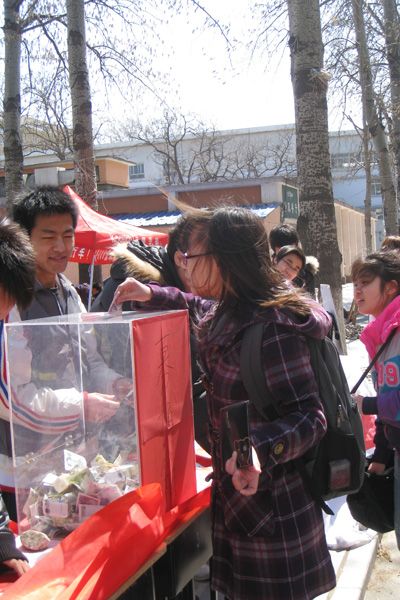 自3月份以来,我国西南地区旱情仍在持续发展,灾情仍在加深、加重,灾区5000万群众的生产生活遇到了严重的困难。西南地区的旱情时刻牵动着我校师生的心。4月2日中午,校学生会、研究生会、志愿者联合会及红十字会在学生区开展了“捐献一瓶水 奉献一份爱”志愿捐款活动,向全校师生发出倡议,号召大家按照每人购买一瓶矿泉水的标准志愿捐款。