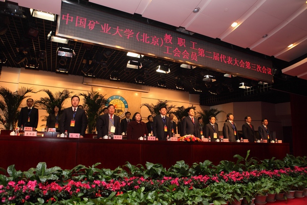 下午3:00,在雄壮的国歌声中,我校第二届教职工暨工会会员代表大会第三次会议在科技会堂四层报告厅隆重开幕。校党委书记杨仁树,校长乔建永,中共北京市委教育工委联络员范国英,中国工程院院士彭苏萍,原校党委书记张保军,副校长孙继平、范迅、姜耀东、王忠强,校党委副书记朱书全,大会开幕式主席团其他成员在主席台就座。91名正式代表和特邀代表、列席代表等近200人参加了大会。全校副高职称以上教职工、副科级以上干部也参加了会议。
