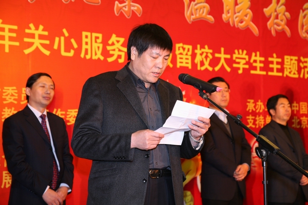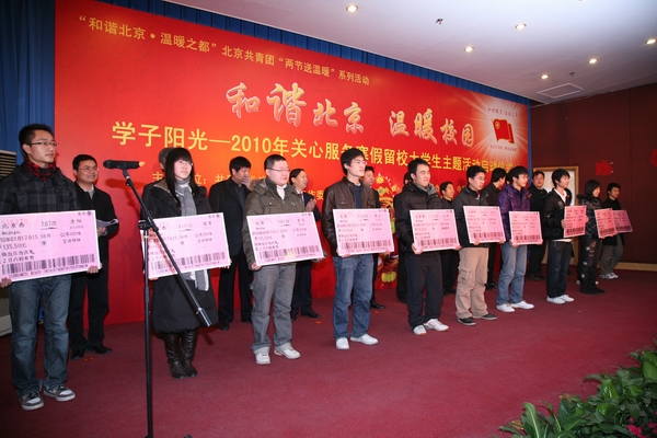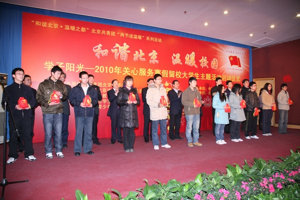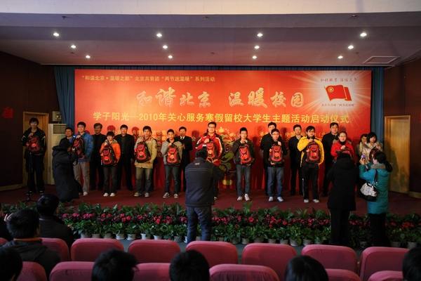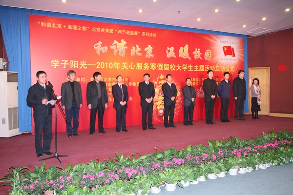 伴随着2010年寒假和春节的即将到来,为了帮助首都各高校寒假留校大学生度过一个充实、快乐的寒假,让大学生充分感受到党团组织和社会的关心与帮助,2010年1月16 日上午,共青团北京市委、北京市学联与中共北京市委教育工委、北京市教委、北京青少年发展基金会在我校隆重启动了“和谐北京 温暖校园”2010年关心服务寒假留校大学生主题活动。共青团市北京委书记王少峰、中共北京市委教育工委副书记王民忠、我校党委书记杨仁树、全国学联主席刘凯、北京市教委副主任郭广生、团北京市委副书记沈千帆、北京亿都川集团公司董事长何博远、全国学联办公室主任张健为、我校党委副书记朱书全、北京青少年发展基金会常务副秘书长陈淑惠、团北京市委大学部部长胡九龙以及北京市80余所高校的200余名寒假留校大学生参加了启动仪式。