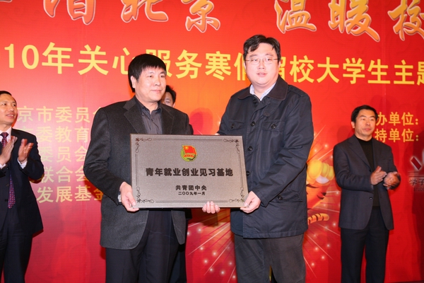 启动仪式上,与会领导向留校大学生代表赠送了“文化小锦囊”、“爱心大礼包”和返乡火车票。全国学联办公室主任张健为向本次活动的赞助企业北京亿都川集团公司董事长何博远颁发了“共青团青年就业创业见习”基地牌匾。