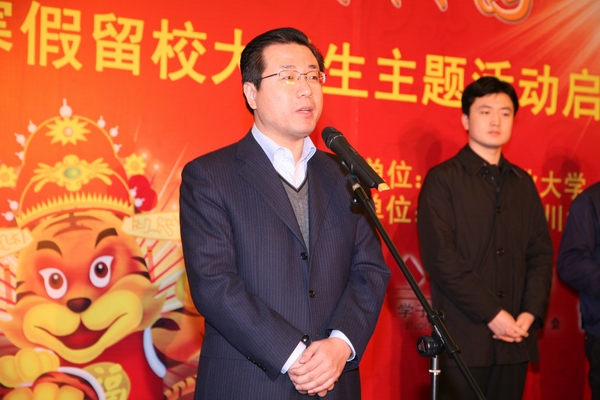 我校党委书记杨仁树在启动仪式上介绍了我校在关心服务寒假留校大学生方面开展的工作情况。杨仁树表示,我校高度重视寒假留校学生工作,专题召开寒假留校学生工作领导小组会议;学校广泛开展文体活动,丰富留校学生的假期生活。春节期间,学校将开展慰问联欢活动,学校领导和教师代表与留校学生共度除夕;学校开展助学助贫活动,为寒假留校学生提供坚强保障。学校划拨专项经费,为每位寒假留校家庭经济困难的学生发放过节补助,并组织学生参加校内外的勤工助学工作,为因贫困未回家以及希望通过社会实践锻炼自己的学生提供实习机会,帮助学生解决实际问题。杨仁树表示,在大家的共同努力下,一定能为留校学生提供更多切实有效的帮助,使留校学生度过一个更加欢乐祥和的春节,营造稳定和谐的校园环境。