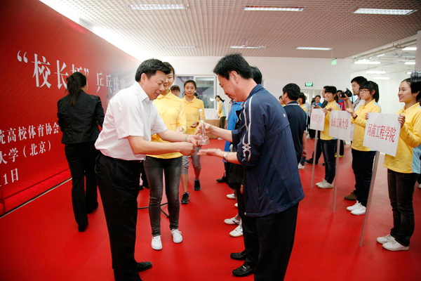 中国矿业大学(北京)党委书记杨仁树为各获奖高校和个人颁发了奖杯,并在闭幕式上讲话。他指出,在紧张激烈的比赛中,大家切磋了球艺、增进了友谊。参赛的9所高校,虽然隶属关系变了、学校名称变了,但我们的血缘关系从未改变。“校长杯”乒乓球比赛使我们之间联系更加紧密。他热忱欢迎兄弟院校领导和同志们常来学校指导工作,祝大家的友谊与日俱增。