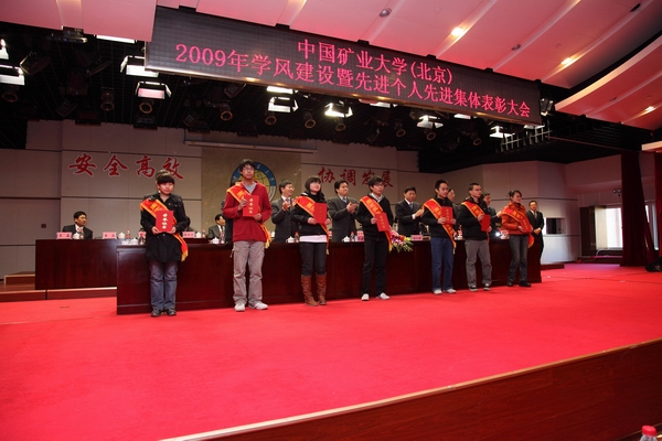 大会在雄壮的国歌声中拉开帷幕,随后对2008-2009学年度国家奖学金、国家励志奖学金获得者;董事会奖学金、孙越崎奖学金、邝寿堃奖学金和校级优秀学生奖学金获得者;年度先进班集体、优秀班主任和优秀辅导员,以及国庆60周年庆祝活动、百年校庆志愿者工作和2009年暑期社会实践工作先进集体和先进个人进行了表彰。孙继平、范迅、姜耀东、王忠强分别宣读了表彰决定和获奖名单。在欢快的乐曲声中,校领导向获奖的先进集体和个人颁发了奖状和证书,会场内不时响起阵阵热烈的掌声。