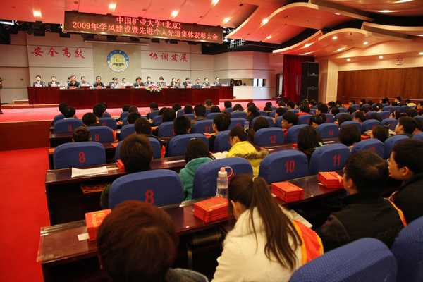 12月15日下午,我校在科技会堂报告厅举行“2009年学风建设暨先进个人先进集体表彰大会”,校党委书记杨仁树,校长乔建永,副校长孙继平、范迅、姜耀东、王忠强,党委副书记朱书全出席大会并在主席台前台就坐,各学院、有关部门负责人也出席了大会。各类先进集体、先进个人获奖代表和全校900余名师生参加了大会。