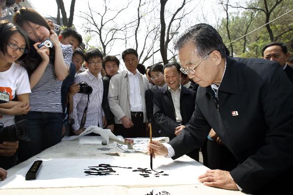沿着100多米长的五四大道,山鹰社、青年天文学会、职业发展研究会、爱心社、学生书画研究会……学生们自发组织的几十个社团正在举办着各项活动,展示他们的学习和社会实践成果。年轻人身上透射出的热情与朝气感染着温总理。在山鹰社前,爱好登山的同学们给温总理戴上了社标。温家宝勉励他们要人比山高、志比天高;在爱心社旁,学生们用手语向他演示着爱与希望的乐曲;在笛箫学社里,年轻人为他弹奏起遒劲有力的古筝;在志愿者协会,大学生志愿者介绍为玉树灾区和西南干旱地区奉献爱心的经历。温家宝与他们亲切交谈,鼓励他们更多地投入社会实践,了解国情……
