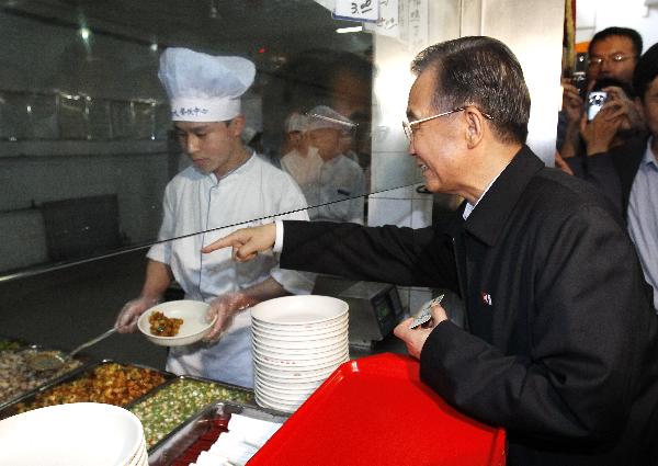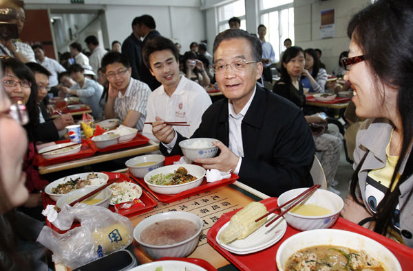 随后,温家宝来到北大学一食堂与同学们共进午餐。他边吃边聊,关切地了解他们的学习生活情况。
