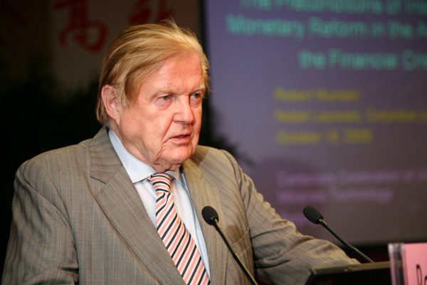 蒙代尔以独特的视角和创造性的思维创造了许多以他命名的著名经济模型和法则,是举世公认的国际宏观经济理论奠基人。在此次论坛上,蒙代尔教授作了《金融危机后国际货币改革与能源经济》的学术报告。在报告中,他深入分析了金融危机的起因及减轻和消除金融危机需要采取的措施,论述了美元作为全球主导货币的地位以及最近公开讨论中提及的可能替代的货币,分析了国际收支失衡产生的影响以及中国等国家提出的国际货币体系改革提议;蒙代尔还在报告中阐述了一揽子货币特别提款权(SDR)体系建立的基础,提出推动全球货币形成的建议方案。