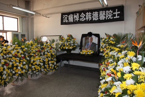 全校师生员工沉痛悼念韩德馨院士,学校在综合楼537室布设了灵堂,供师生员工和各界人士吊唁。灵堂内庄严肃穆,菊花、挽联寄托着全校师生员工的哀思。灵堂正中摆放着韩德馨院士遗像,遗像中的韩院士目光慈祥、亲切和蔼。
