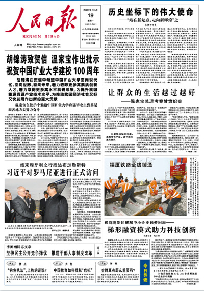 【人民日报】胡锦涛致贺信 温家宝作出批示 祝贺中国矿业大学建校100周年