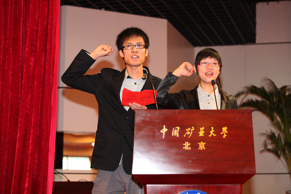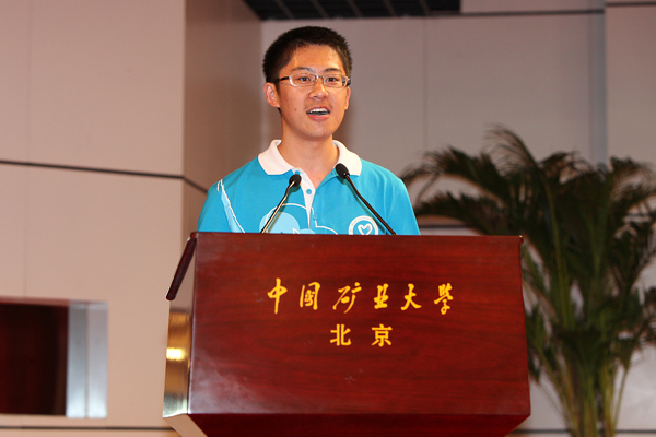 志愿者代表、化环学院公维博同学发言,满怀信心地表示志愿者将用誓师会上热情的微笑,满腔的热忱展示出矿大人良好的精神风貌,并在母校需要我们时,迎难而上,全力为校庆服务。