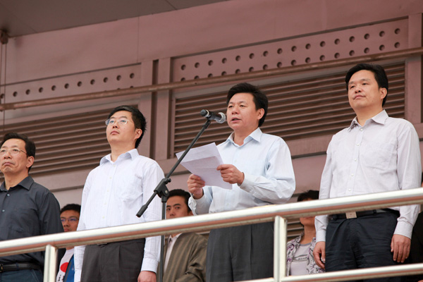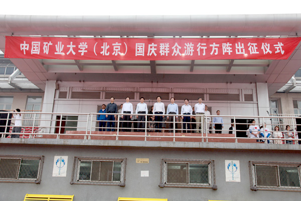 9月29日下午,我校在体育场举行首都国庆60周年群众游行方阵出征仪式。校党委书记杨仁树,校长乔建永,副校长孙继平、范迅、姜耀东、王忠强,校党委副书记朱书全,以及各学院、相关部门负责人出席了大会。