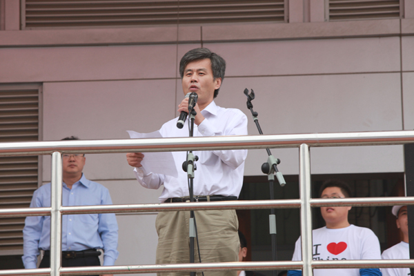 朱书全在主持仪式时希望同学们把最高昂的热情和最喜悦的笑脸展现给全世界,展现给伟大的祖国,以最整齐的步伐来诠释矿大学子们拳拳的爱国心和浓浓的爱国情。