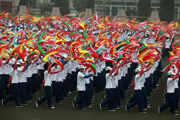 仪式上,伴随着雄壮的乐曲,由1168名师生组成的、经过百余天艰苦训练的国庆60周年游行方阵,踏着整齐的步伐,舞动多彩的绸巾,依次通过主席台,接受校领导的检阅,赢得了在场领导和师生的热烈掌声。