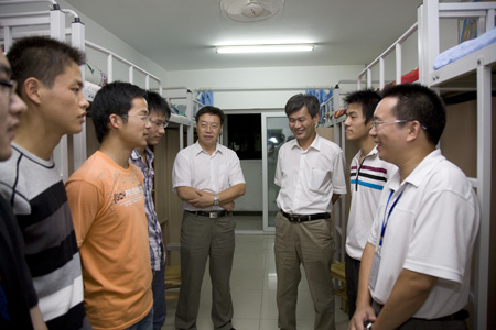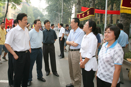 校党政领导高度重视迎新工作,9月1日上午,校党委书记杨仁树,校长乔建永,副校长孙继平、范迅、姜耀东、王忠强,党委副书记朱书全来到迎新现场,实地考察了迎新流程,看望现场的工作人员,并与学生家长和新生亲切交谈,听取家长对学校工作意见和建议,鼓励新生珍惜大学时光,好好学习。晚上,范迅、朱书全又来到学生宿舍,看望了部分家庭经济困难新生,详细询问了他们的住宿、生活情况,并代表学校送上了书包、电话卡等慰问品。在看望部分新疆学生时,校领导要求有关部门一定要做好工作,帮助他们尽快适应大学的学习和生活。