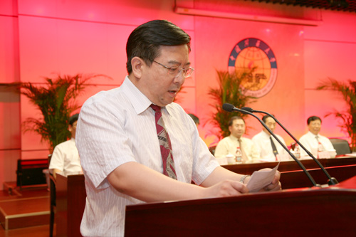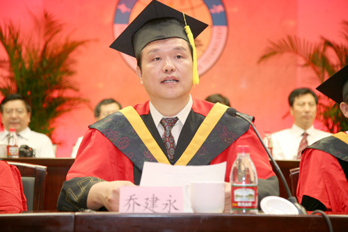 校长乔建永教授在会上发表了热情洋溢的讲话。他首先代表学校党委、行政向同学们顺利完成学业表示热烈的祝贺,向为学校人才培养付出辛勤汗水的全体教职员工表示崇高的敬意。乔建永说,同学在校学习期间,正值我国高等教育事业大发展和学校改革和发展的重要时期。近年来,学校始终坚持“办精、办强、办特色”的发展思路,以质量求生存,以特色求发展,牢固树立改革意识和创新意识,坚持走内涵发展之路,学校的各项事业取得了长足进步,办学规模不断扩大,办学实力明显增强,办学水平显著提高,社会影响力不断增强,基本实现了“一年一变样,三年大变样,五年达标创优”的阶段性发展目标,学校各项事业迈上了新台阶。学校取得的成就与广大学生的贡献密不可分,大家既是学校事业发展的见证者也是受益者,既是参与者更是创造者,正是通过大家的共同努力、奋勇开拓,才迎来了学校事业发展的崭新局面。