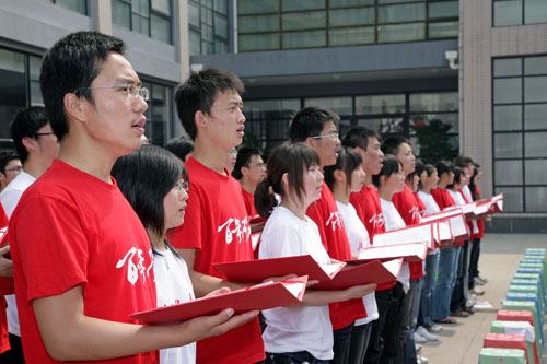 嘉宾致辞结束后,现场千余名师生合唱源起于1934年焦作工学院时期的校歌,嘹亮、雄壮的歌声把揭幕仪式推向了高潮。校歌词作者为中原名儒李敏修先生,曲作者为我国音乐理论家、音乐教育家张洪岛先生。传唱七十载的激昂旋律,充分展现了老一辈矿大人救国重劳工的豪情壮志,更彰显了矿大新一代莘莘学子行健天同功的浓浓报国之心、效国之行。
