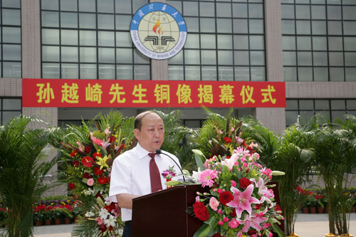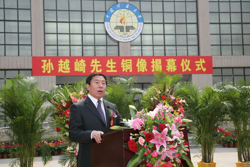 国家能源专家咨询委员会副主任、中国煤炭学会理事长、孙越崎科技教育基金会副主任、原煤炭工业部副部长濮洪九,代表中国煤炭学会和孙越崎科技教育基金会,向孙越崎铜像落户我校表示祝贺。他表示我校隆重举行孙越崎先生揭幕仪式具有深远意义,希望我校能够继承和发扬孙越崎先生忠贞不渝的爱国精神、求真务实的敬业精神和鞠躬尽瘁的奉献精神,为我国能源工业的科学发展、培养出更多的德才兼备的优秀人才。中国煤炭学会、孙越崎科技教育基金会将会一如既往地关心和支持我校发展,希望我校以此次揭幕仪式为契机,奋发进取,努力开拓,为推动国家煤炭工业可持续发展做出更大的贡献。