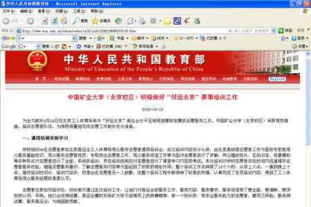 为全力做好4月19日在北京工人体育场举办“好运北京”奥运会女子足球预选赛附加赛的志愿服务工作。中国矿业大学(北京)采取有效措施,培训志愿者队伍,为保质保量地完成志愿工作做好充分准备。