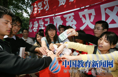 五是组织师生开展向灾区人民捐款捐物活动。北京大学号召师生员工发扬公益精神,向灾民伸出热情援助之手,与灾区同胞共度难关,目前仅学生已募集捐款7万多元。中国政法大学向全校师生发出向汶川地震灾区紧急募捐的号召,目前师生捐献的10万元款项已通过中国红十字会转往灾区。辽宁中医药大学情系灾区的募捐活动收到了30万余元善款。天津大学第一笔2万元捐款已送至天津市红十字会。忻州师范学院师生员工已捐款46万余元,首批捐款30万元已转交灾区。吉林大学、南京大学、苏州大学、江苏大学均积极组织师生员工为灾区募捐,用爱心温暖灾区人民的心,帮助他们战胜困难,增强信心。苏州科技学院退休教师盛承懋教授夫妇专程赶到学校,通过校工会向地震灾区捐出5000元。常州工程技术学院已将师生捐赠的第一笔款项汇到中国红十字会“汶川地震救援”紧急救灾专用账号。重庆大学动员全校师生发扬团结互助精神,组织师生积极为灾区人民捐款。东南大学、湖南大学积极组织师生近期开展为灾区人民献血活动。华南理工大学、江南大学、中国药科大学等高校还向四川省受灾高校发出慰问信。山东服装职业学院全体师生员工立即行动,踊跃为灾区群众捐款,今天不到一上午的时间,全院捐款数额已达6万多元。