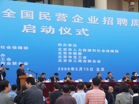 为积极应对国际金融危机对就业形势的影响,缓解高校毕业生和农民工的就业压力,更好地发挥民营经济在促进就业中的作用,由人力资源社会保障部、全国总工会、全国工商联、教育部和国务院扶贫办联合主办的“2009年民营企业招聘周”活动启动仪式于5月15日上午,在全国农业展览馆举行。