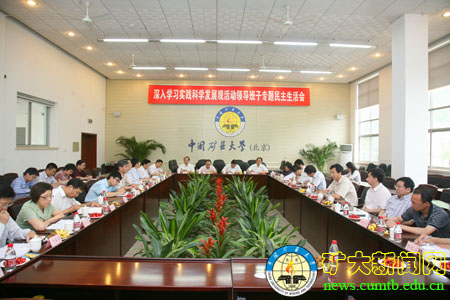 在广泛征求各方面意见、深入谈心、认真准备剖析材料的基础上,5月21日下午,我校深入学习实践科学发展观活动领导班子专题民主生活会在1号办公楼第一会议室举行。中央学习实践活动指导协调二组林剑同志,教育部部属高校深入学习实践活动指导检查第二工作组组长卢铁城,副组长陶文沂、黄百炼,联络员王家勤,工作人员刘春晓,中共北京市委教育工委联络员范国英,全程参与了专题民主生活会。校党委书记杨仁树,校长乔建永,副校长孙继平、范迅、姜耀东、王忠强,校党委副书记朱书全在会上做了发言,针对各自分管工作等方面存在的问题,产生问题的原因,改进工作的思路和措施等,进行了深刻的批评与自我批评。